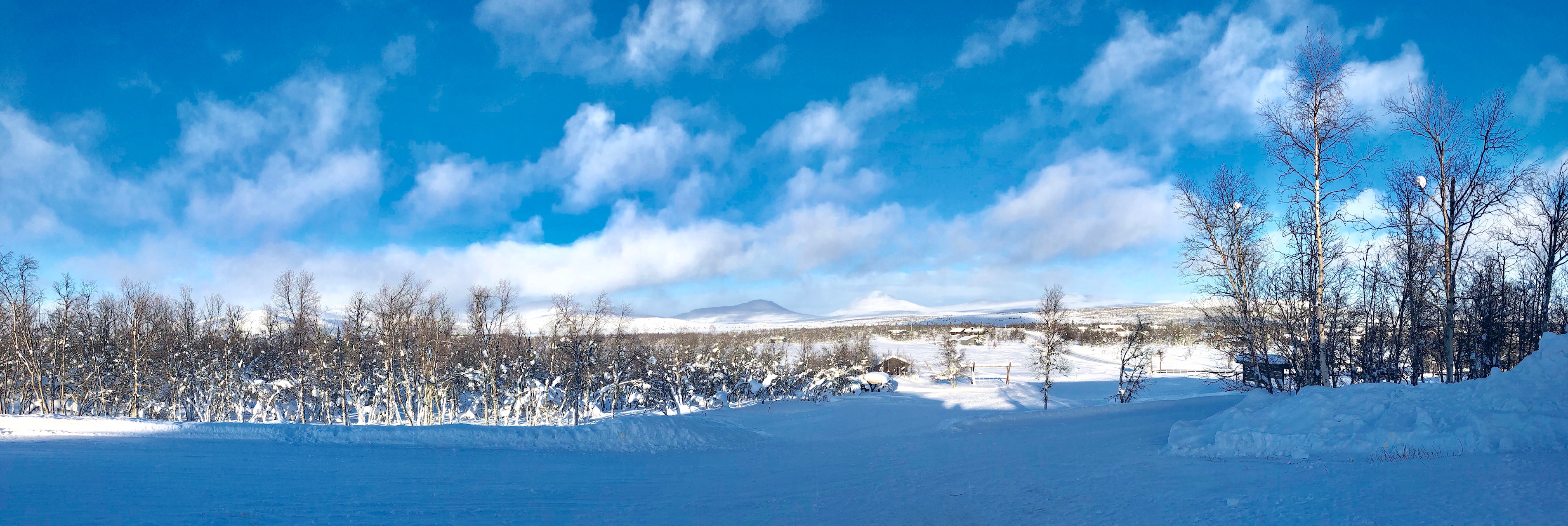 Back outside, with the spindrift on our backs, we headed for the shelter of the trees and the Trimløype. A group of weary snowshoers looked longingly at us as they beat a path into the wind and towards the sanctuary of the Fjellhotell. By way of contrast, the Trimløype was a place of tranquility and peace, with the sun glistening on the snow and occasional glimpses of Muen and the surrounding mountains to the north and east.
