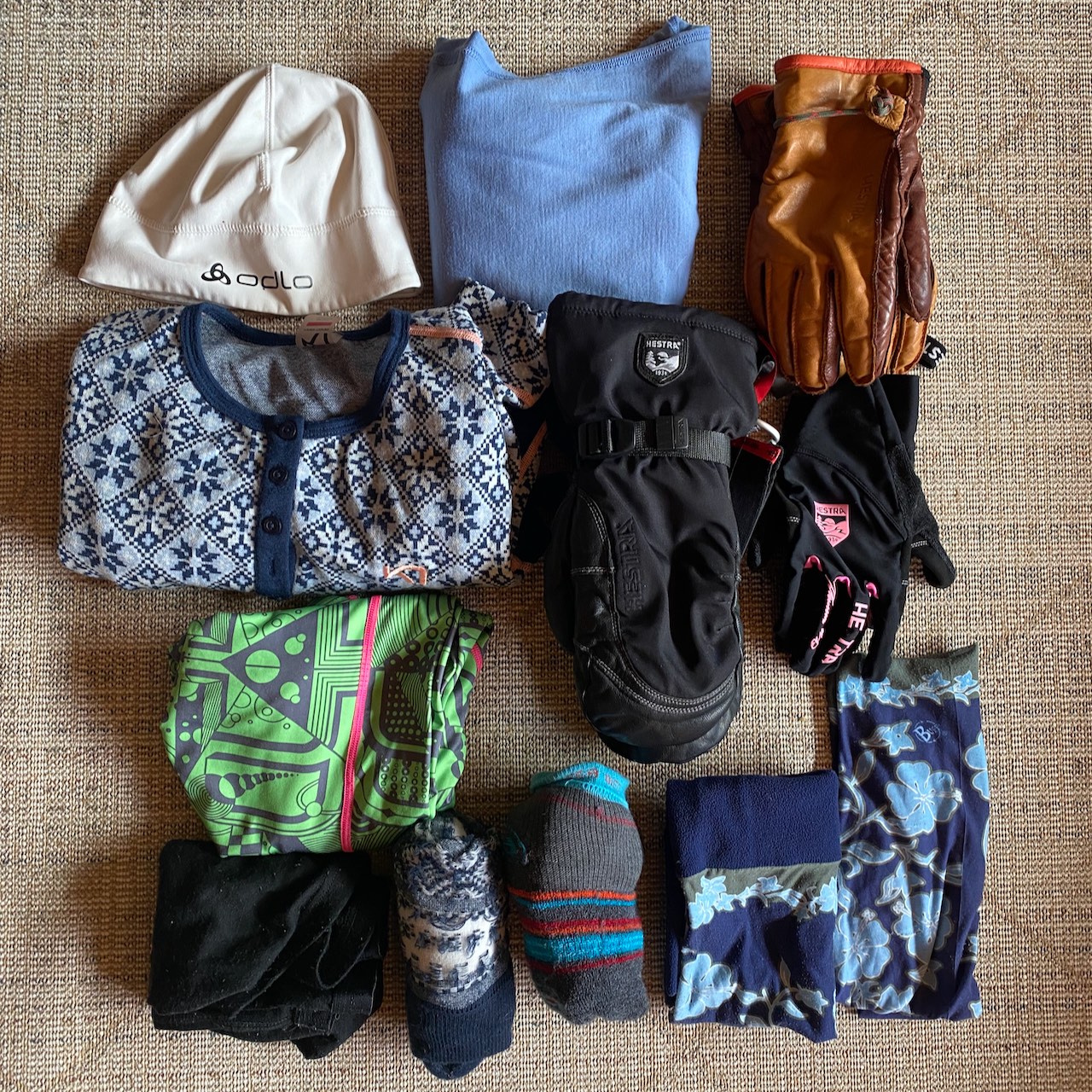 Base layers and warm items for head, toes and fingers - I prefer 3 pairs of gloves - light, medium and extra warm gauntlet gloves. They all get used!