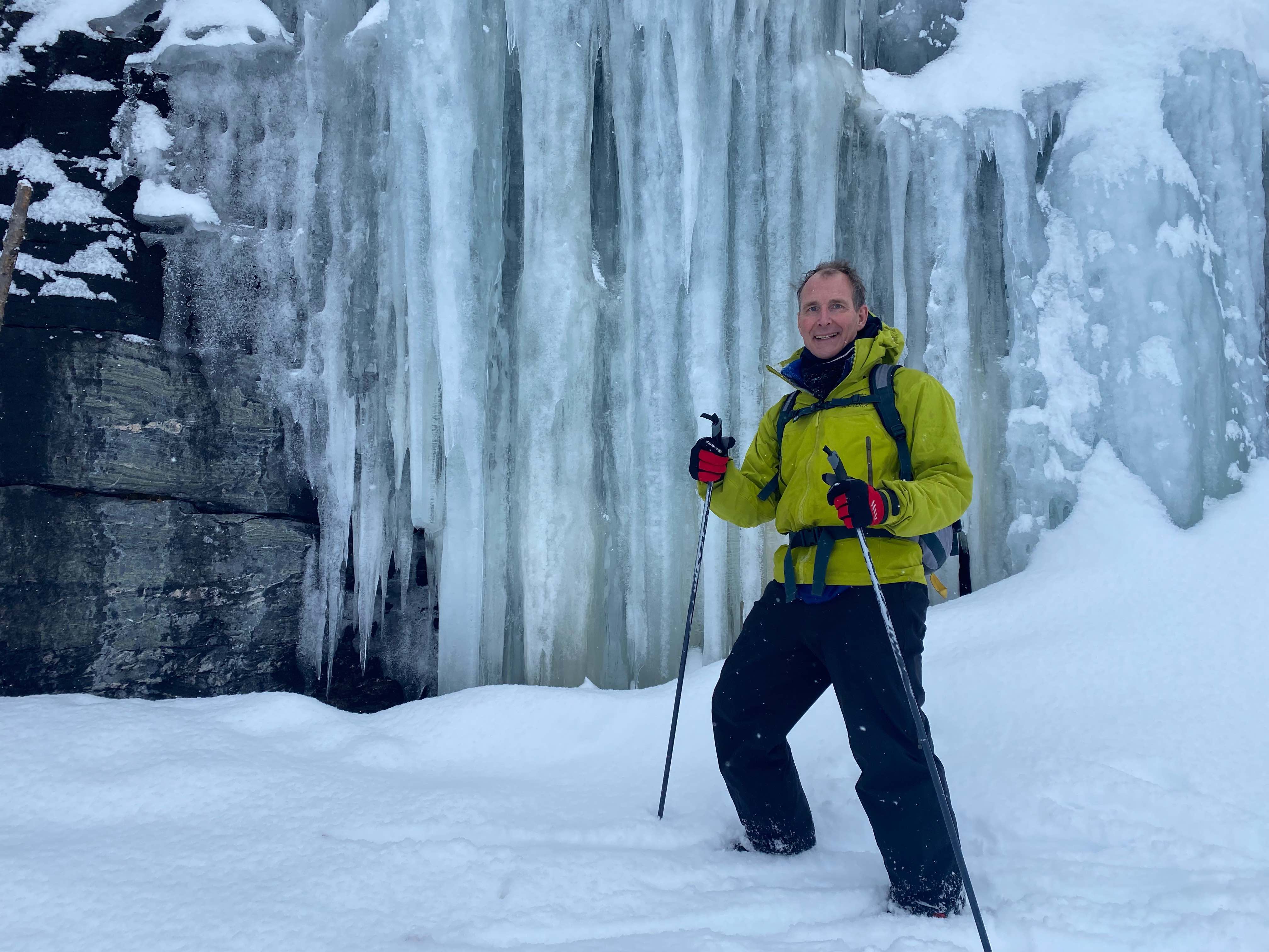 Skiing past icicles while snow is softly falling in the Jotunheim