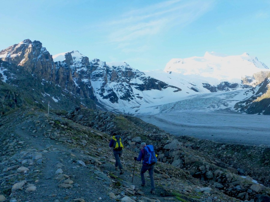 We begin the day with a descent traversing round Mont Rogneux. It is always a pleasure to start our day high in the mountains and we will hope for a good sunrise. This morning we aim to visit the Cabane de Brunet for lunch before heading up an impressive gorge to the toe of the immense Corbassière glacier, one of the largest in Europe. In 2014, a new 240 metre (787ft) suspension bridge was put in place over the moraine enabling walkers to cross with dramatic views right onto the glacier. At this stage we may follow the route lower route to the suspension bridge or take the slightly more challenging alternative route via col des avouillons. When you reach the the col you are wowed by the Corbassière Glacier and in the distance you can see your hut for the night. From the col we descend to the impressive suspension bridge and make a short but steady climb up to the recently built Cabane de Panossiere where we spend the night. A beautiful situation for the evening, with views of the mountains and the Grand Combin and good chance of viewing ibex parading on the hillside.