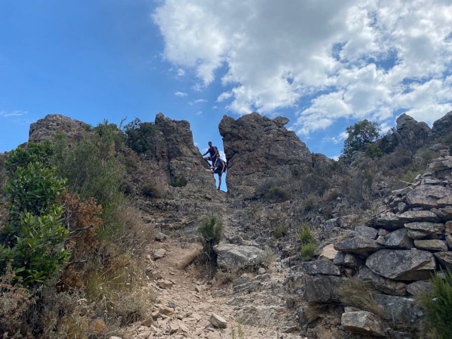 A spectacular day today which begins early morning with a hike to the Col d'Incudine, from where we have wonderful views back towards Monte Cinto, the highest peak in Corsica. We can also see the island of Sardinia in front of us, which lies immediately south of Corsica. It that isn't enough to keep the photographers happy we also have views to the Aiguilles de Bavella where we will soon be heading. First thought we have a descent on rocky slabs to the Refuge d'Asinau. The refuge takes its name from the seven Towers of Asinau which feature on the ridge we are heading for. Leaving the refuge we follow an easy woodland trail before a climb to the Aiguilles de Bavella, this variant offers a spectacular route through spires, and boulders, and we have a section of chains to help with conquering a steep rock slab. The Aiguilles de Bavella are rocky spikes of red granite that dominate the hill of the same name, the word 'aiguilles' means 'needles'. A good indication of the type of terrain we are tackling.