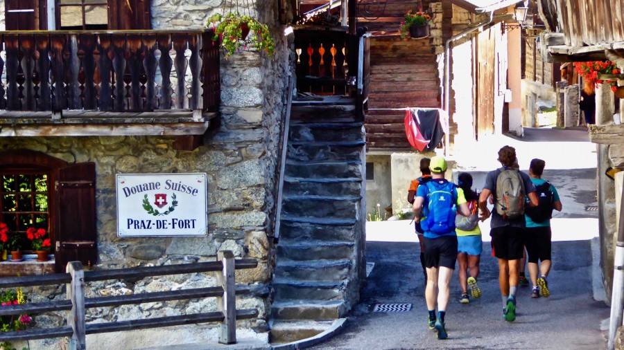 Setting off through the streets of the ancient Roman town of Courmayeur, we run up a gentle hill through hamlets of ancient wooden buildings with traditional architecture. We soon leave the tarmac behind to climb steeply through the shady larch forest and into the mountains via a zig-zagging trail which is mostly in shade. We then traverse a beautiful trail around the mountain, often taking in several small summits, which in our mind offers the most incredible views of the Mont Blanc mountain range, a truly amazing trail run. Eventually, we reach the famous Rifugio Bonatti, a gorgeous refuge dedicated to the mountaineer and photographer, Walter Bonatti. The trail continues through the alpine flower meadows before descending to Arnuva, and then there is a long, but steady climb to the Swiss frontier at the Grand Col Ferret. The wide, runnable trail descends and then traverses along the hillside before dropping down to the lovely Swiss village of La Fouly at 1600m where we will spend the night.