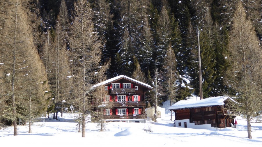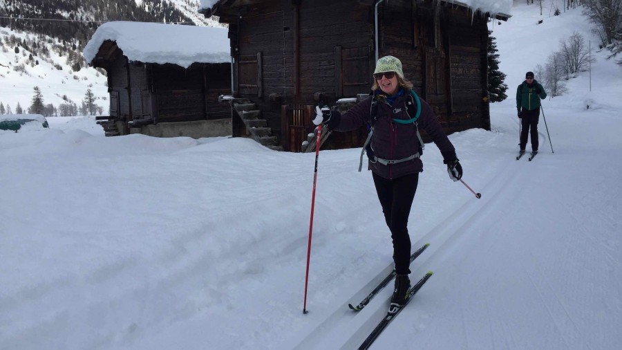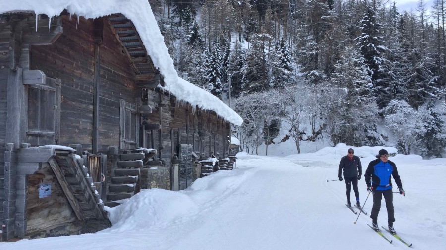The cross-country ski tracks wind along the entire Obergoms valley, and today we start by taking the local train to the village of Münster. From here we begin our ski journey down the valley towards Neiderwald. The villages in this valley are truly wonderful, made up of old traditional houses of dark brown or black weathered wood with a topping of snow, and red window shutters. The route takes us through woodland, over rivers, and past old settlements, and provides plenty of options for loops and variations on the route. A morning stop at Reckingen where the farmer and his wife serve excellent coffee and cake is a must. We then continue to Neiderwald where lunch is often in the wonderful old cafe of "Drei Tannen", again a feeling of having stepped back in time.