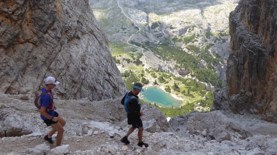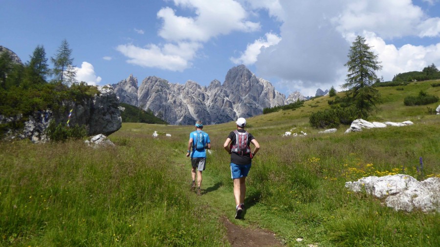 We start with a taxi ride to the famous beauty spot of Lago di Braies and true start of the Alta Via trail. The lake is spectacular filled with turquoise waters surrounded by towering cliffs. After running along the lake shore we begin to climb steadily under the striated cliffs of Monte Muro to our first pass at Porta Sora il Forn, at 2388m (7832ft), to be rewarded with immense views, and with the glacier of the Marmolada glittering to the south west. the glacier is the only major ice field in the Dolomites. After taking in the views its a short trot down to the Rifugio Biella for a a morning coffee, or whatever else takes your fancy. We then have a lovely descent through flower meadows and farms and onto a steep jeep road takes which takes us down to yet another delightful Rifugio - Sennes. A break can be taken here if necessary or we continue on to Rifugio Pederu where we plan to stop for lunch. In the afternoon a steady climb takes us up through the wild and rocky Vallone di Rudo to Lago (lake) Piciodil, and with the reward of an excellent overnight stay in the heart of the Fanes nature park at Rifugio Fanes. Rifugio Fanes was built in 1928 has a long history and is an idyllic spot for a rest in the heart of the mountains.
