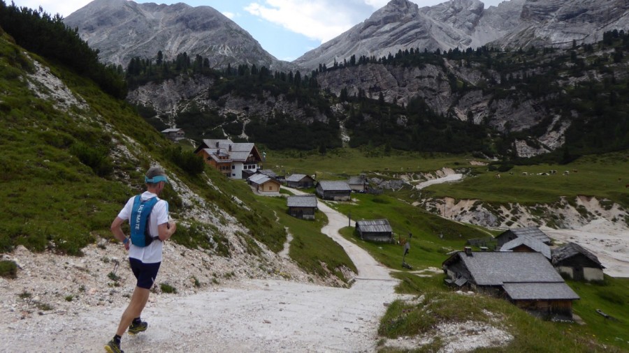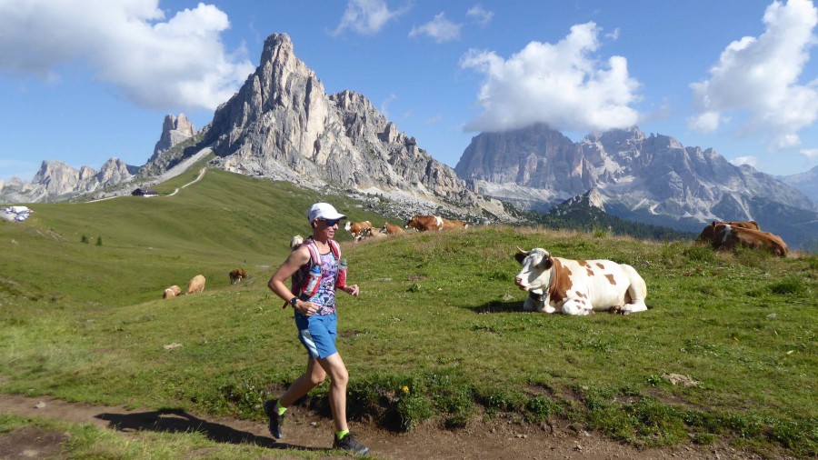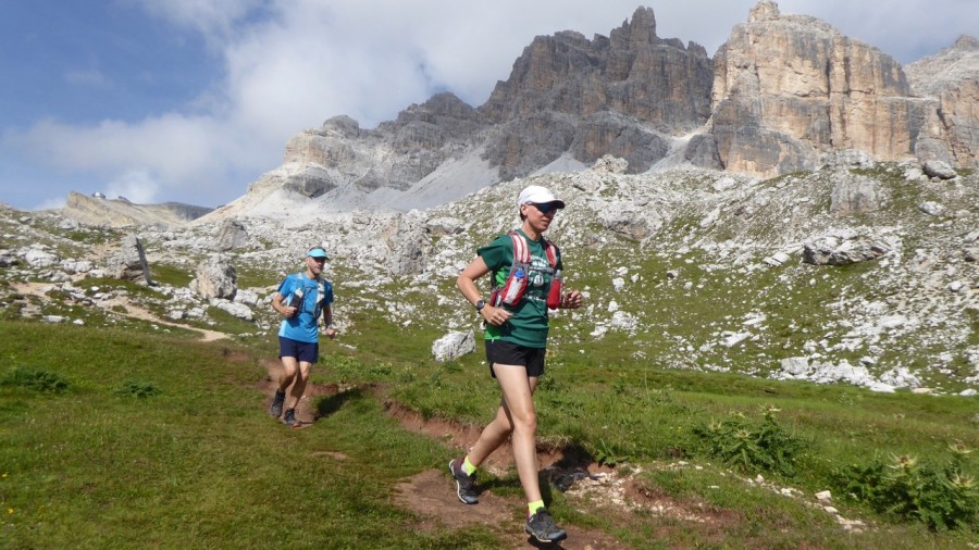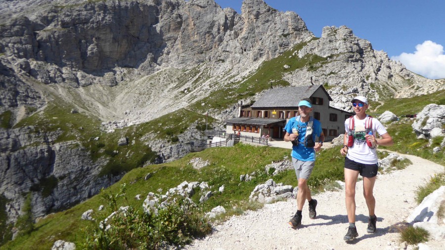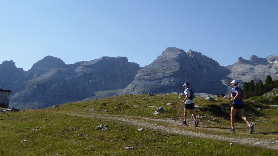 Leaving the Col we make a short climb to reach a beautiful traversing trail which brings us to the rustic Rifugio Dibona were we can enjoy a cappucino on the terrace, then it's a steep descent through the larch forests before climbing all the way back up the other side of the next valley. On route there will be time to explore the 'sentiere de trenci' the open air WW1 trench museum around the base of the towers before setting off on our next climb of the day to the pass at Averau. However, there is the reward of refreshments at the top at another lovely Italian Rifugio. If the weather allows we love to extend this day climbing up to Rifugio Nuvolau and summit of the same name. You will notice a theme developing - run, coffee, run, cake, run, lunch! We end this rather unique day with a rocky traversing trail under impressive cliffs that takes us to the pass and our accommodation at the famous pass of Passo Giau, at 2236m (7334ft) and the 3* mountain hotel where we spend the night. Enjoy a wonderful sunset here with impressive views north towards Cortina and south further into Veneto. We are now well on our way along the fabulous Alta Via 1 trail.