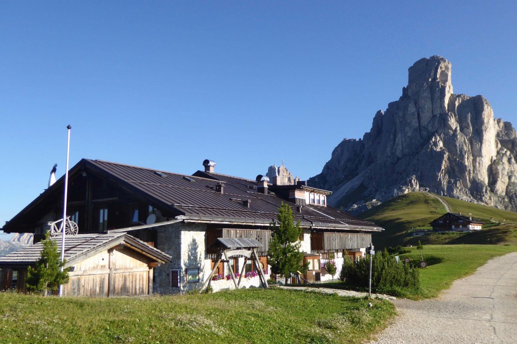 The Berg Hotel, 'berg' means mountain in German, is in a stunning location beneath the towering spires. It sits at 2236 metres (7330ft) on the Passo Giau which has featured in the famous Giro d'Italia road bike race. It has 10 bedrooms and is one of the highest and remotest hotels in the Dolomites. There are wonderful views of the valley of Cortina d'Ampezzo and the peaks of the Tofane, Croda Rossa, Cristallo and Croda da Lago. A wonderful overnight location.