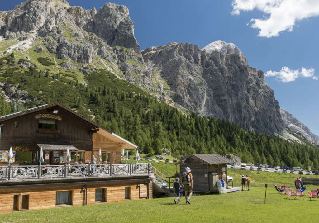 Rifugio Col Gallina is situated at 2055m (6742ft) just below the Falzerego pass, between the mountains of Lagazoui and Averau. It prides itself in being an eco-sustainable accommodation made of wood and stone, nestled in the heart of the Dolomites at 2055 meters above sea level.