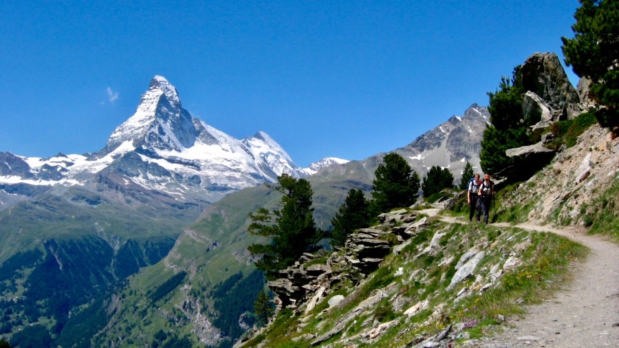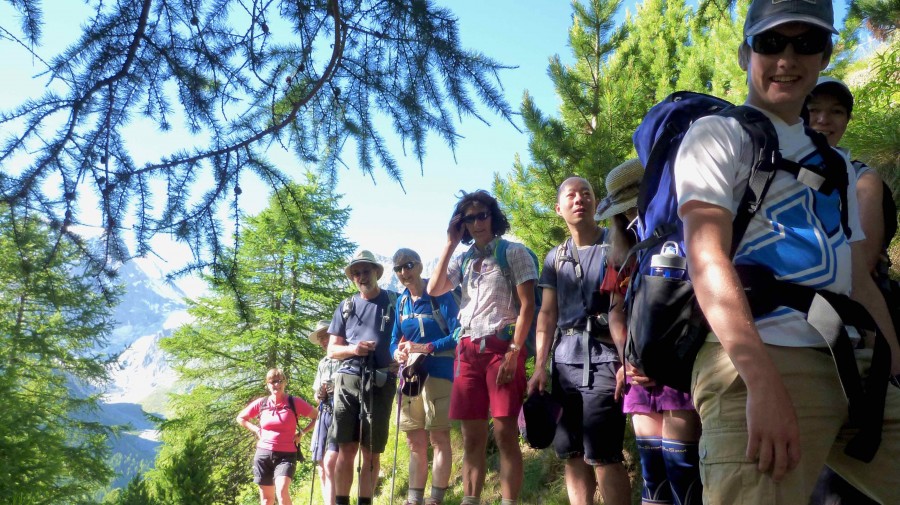 Today we begin with a scenic transfer from the village of Zinal to the Mattertal, the valley which is home to Zermatt, one of the most famous alpine towns in the world. Our hiking begins at the tiny mountain community of Täschalp with its quaint and characterful mountain homes and summer meadows, where the cows graze and local cheese is produced. It is here that we join the stunning Europaweg hiking trail which will lead us all the way to Zermatt. With fabulous views of other famous peaks such as the Weisshorn along the way and the perfect opportunity for breath-taking photos this is a route that is a 'must do' for those hiking to Zermatt. Traversing the mountainside the trail gently undulates until we begin our descent into the town through the pine trees. Our trail features areas of Arolla Pines, the favoured food and haunt of the Nutcracker birds which collect up to 30,000 pine seeds per season - we are still to learn who worked this out! Arriving in town be prepared for a culture shock - alpine climbers with ropes and ice axes draped on rucksacks, mingle with couture clad tourists, and grubby hikers who have clearly been 'in the mountains'. It is a melting pot of cultures, lifestyles, and general 'buzz'! We love it!