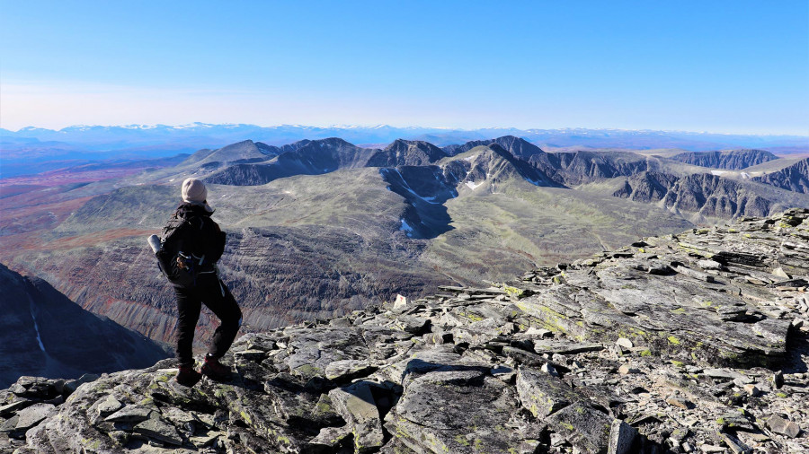 Today we hope to climb a 2000m (6560 ft) peak in the Rondane National Park. In Norway hikers love to collect 2000m peaks, rather like Munro bagging in the UK where the goal is mountains over 914m (3000 ft). Throughout Norway there are 291 summits that reach the magical meterage and our base at Rondvassbu has seven in the nearby area so we have a few to choose from. We may opt to ascend the popular peak of Veslesmeden which has a summit at 2015m (6609ft). There are great views during the hike of the long lake of Rondvatnet which lies below us. Wild views today from the tops, and with clear weather we can look into the Jotunheim National Park in the far distance. You may find yourself buying a 'pin' with the summit name and height on your return to our DNT cabin, let's hope so, because it will indicate you've made the top!