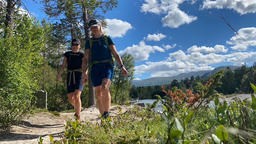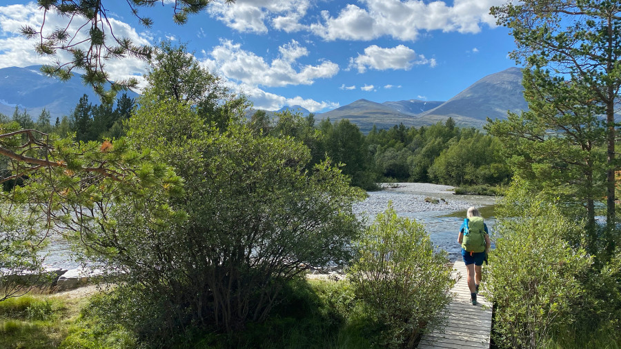 Today is our final hike as we leave Rondvassbu and Rondvatnet and head for our destination at Høvringen. We first of all head up onto the plateau and test our stone stepping skills as we cross a few streams burbling their way through the low growing juniper and boy myrtle. Our views are wide open today as we make our way towards an ancient hunting cabin that is built into the rocks. It's a cosy retreat from the weather if we require it, and is a great early lunch stop. We continue across the mountain while steadily losing height as we head towards the Peer Gynt Hytta, which on holidays, is open for coffee and waffles. All around these mountains there is reference to Henrik Ibsen's five-act play Peer Gynt. But nowhere is Peer Gynt more tangible than at the stone hut on one of Rondane's most beautiful streams that bears his name. From here we head towards the lovely mountain lodge of Smuksjøseter. The final section of the trail is lovely, gone are the rocks, as we follow a sandy path through the mountain heather which leads us to the ancient settlement of Brekkeseter with its wonderful traditional buildings. Then it's a short hike to our overnight hotel at Høvringen, and a well earned sauna.