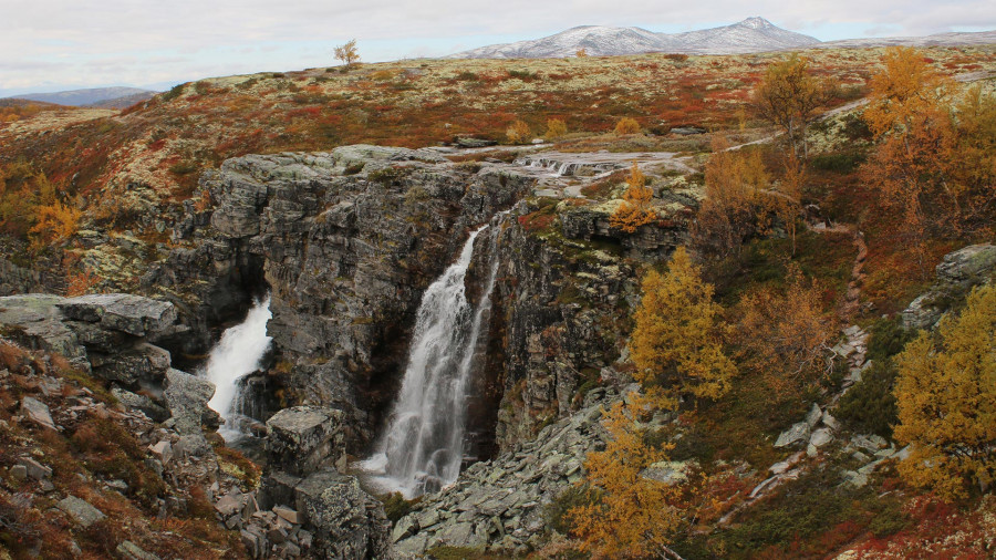 Our day begins with a gentle hike along the river bank, before branching off to the south and climbing to the high ground beyond. The route follows along beside a spectacular rocky gorge that has cleft this mountain landscape. On the way you may see lemmings running through the low growing ground shrubs and lichens which cover this land. After a few hours we being climbing to today's high point as we traverse the rocky mountainside, encountering our near daily stream crossing. With great views of the highest mountain in the Rondane, and the river valley ahead it's a lovely hike. A descent leads to a waterfall and a footbridge which marks the beginning of our final climb of the day. A short descent takes us to the fabulous log cabin where we will spend the night, and enjoy some of the best food to be had on the trail!