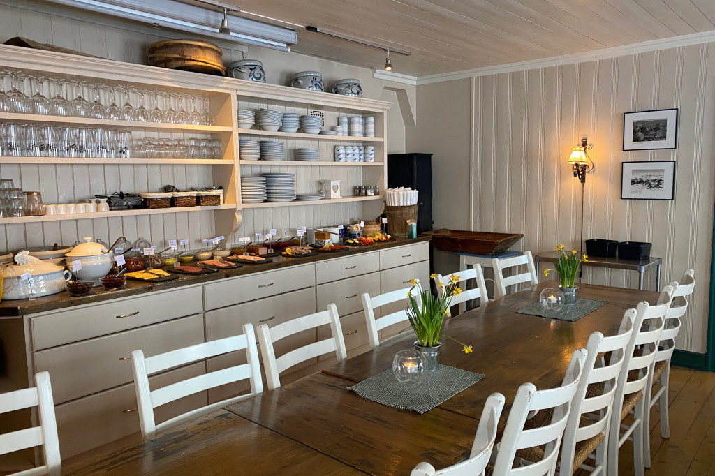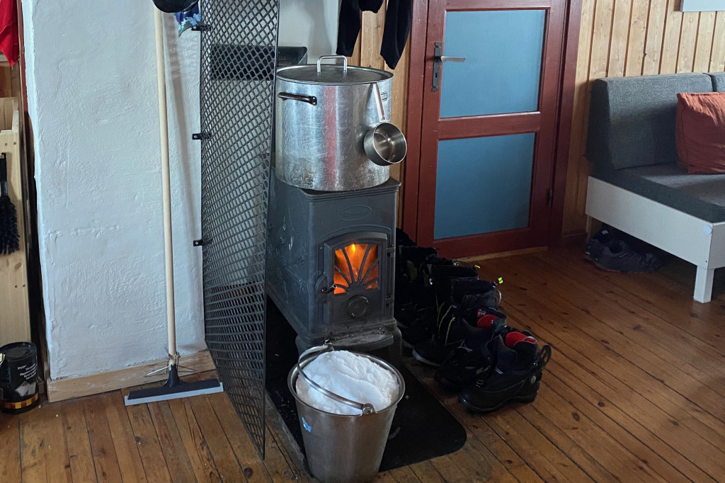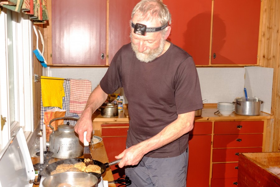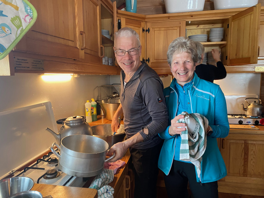 Teamwork to start our day as we all help prepare breakfast and organise our lunches. It's lovely to get the wood-burning stove fired up early, and to wake up to the sound of the kettle boiling! The great thing about the self-service huts is that they have a 'help yourself' store of dried and tinned foods. They also have a store of wood, and come with pillows and blankets. It really is an amazing system based on trust and honesty as we make a list of what we use and pay many months later when the DNT Trekking Association sends someone round the huts to collect the 'slips' that list our details and use of food.