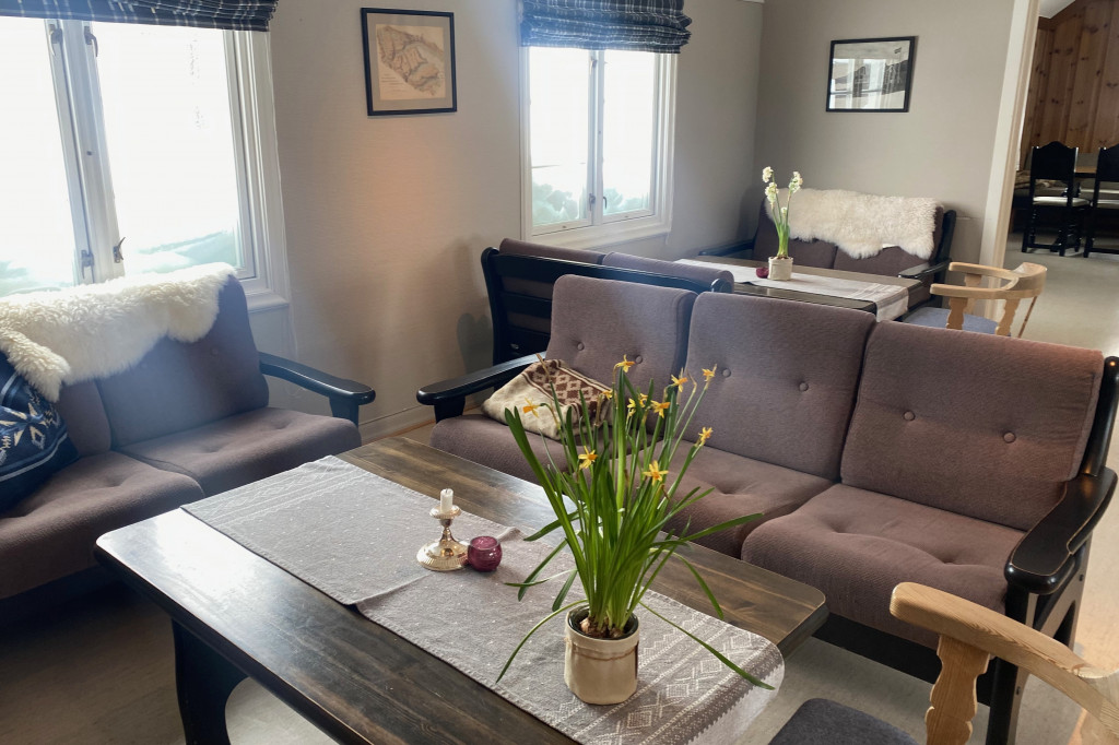 The hut at Geiterygg is a 'serviced or catered' hut and has a total of 88 beds. You will not be required to prepare meals, it will all be done for you, and the food is excellent. There are a few rooms with 2 bunk beds, or 4 bunk beds, and there are 44 bunks in a dormitory annex. Both the main hut at Geiterygg and the annex have indoor toilets, showers and a drying room. There is also a very comfortable lounge area and a small shop.