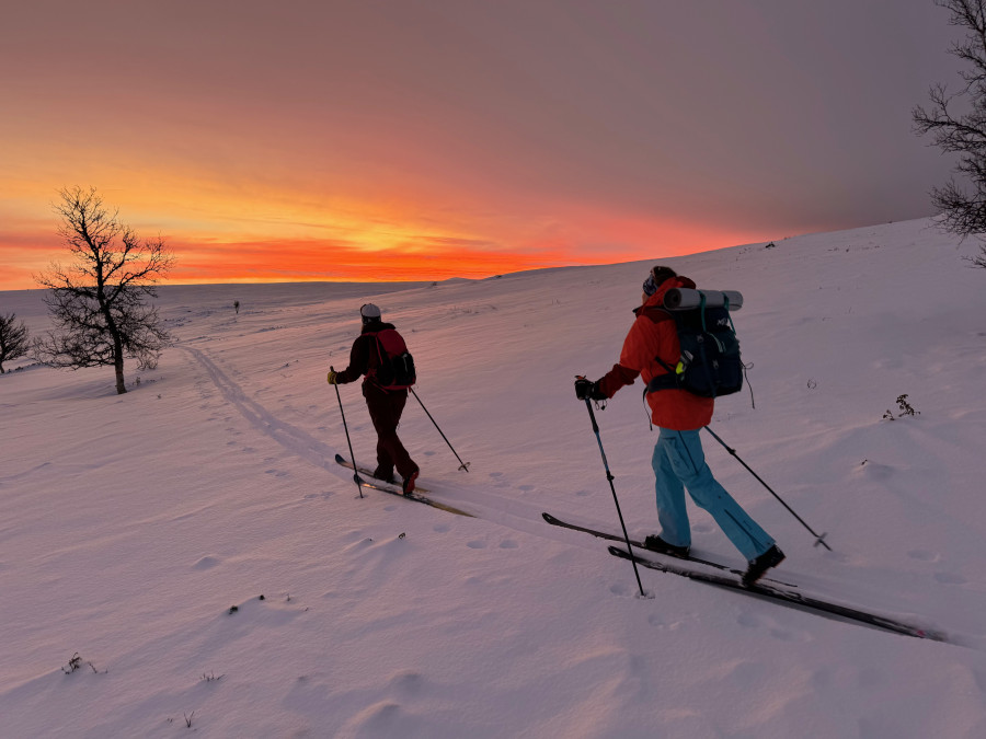 Winter temperatures in Scandinavia are 'according to the locals' becoming warmer, which is why we now run trips in the months of January, and February, as well as the traditional ski touring months of March and April. Even in January when the daylight hours are short we find that we have more than enough time for skiing. We have never yet had guests feeling they were losing out in terms of ski hours by booking in January or February. There is a special pleasure to starting your ski day in the sunrise, and skiing back with the sunset.