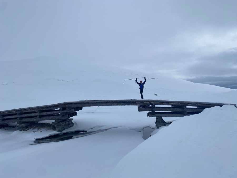 This morning we make the journey to Hjerkinn, an ancient and historic settlement which can be dated as far back as 900 BC. Our initial ski route follows along the pilgrims route, the Kongsleden, or King's Trail, to the settlement of Hagaseter. It is at this point that we leave the valley and begin our climb into the mountains. We are heading for a wide open high plateau that truly gives a sense of wild open spaces, and winter wilderness. The terrain is very typically Nordic and undulates throughout the day as we follow a gully line treating us to some steady climbs, mixed with some fun descents. Today we are entirely within the Dovrefjell National Park which was originally set up in 1974 before being expanded in 2002. The aim was to protect an untouched mountain area, and preserve an alpine ecosystem with its natural biodiversity. When the views open up to the south we will see the Grimsdalen, our destination for today. This area is characterised by wide plateau cut by deep sided valleys. We take a route which sends over the gentle summit of Fallfosshøe which sits at 1342 metres (4401 ft). Then it's a long descent, partially through birch woods, down to the valley and our overnight at our cosy DNT mountain lodge.