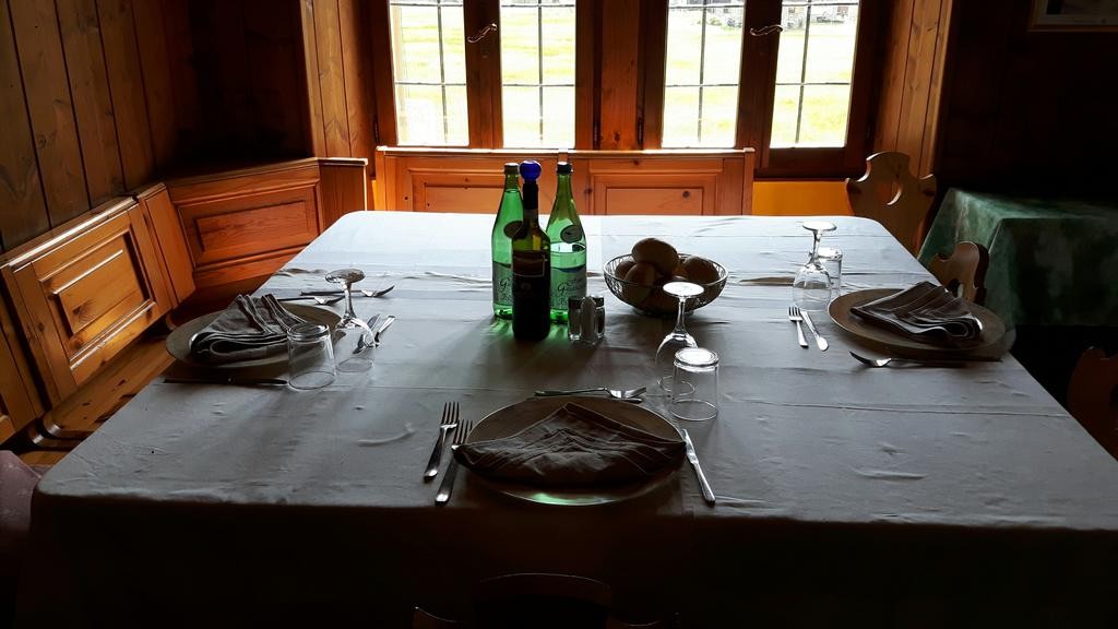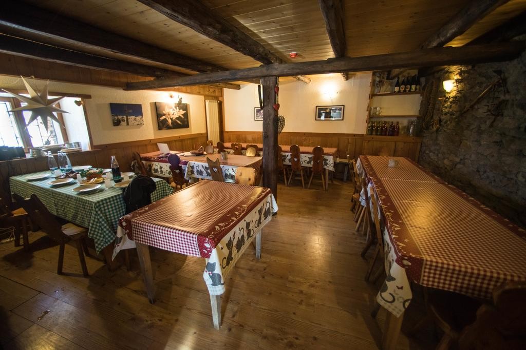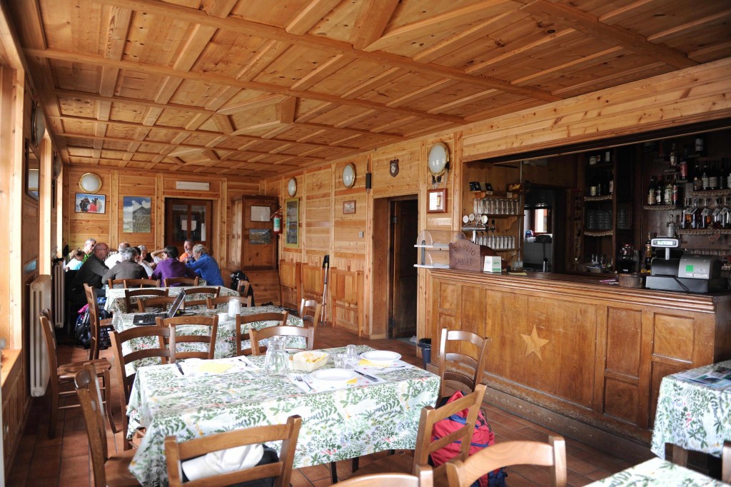 The Rifugio Gabiet is in a lovely situation beside the lake of the same name. After our descent from Col d'Olen a seat on the terrace with a cold drink is very welcome. The Rifugio is cosy and has recently installed new hot water showers, and toilets. It has a dining room, a bar and a living room which is heated by a fireplace and equipped with a small alpine library.