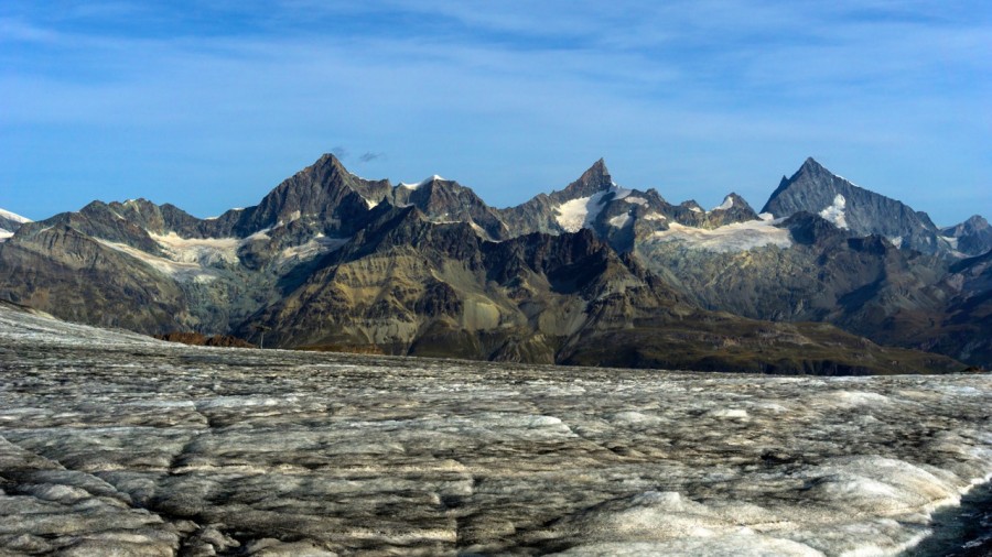 A mostly downhill day today as we descend from the rifugio at 3316m (10,876ft) to Zermatt at 1608m (5274ft) via the Theodule Glacier. The Theodole has various spellings depending if you are on the German speaking side of the col or the Italian speaking side in which case it is the Teodulo! If the weather is good then the early morning light offers fantastic photo opportunities of the big 'M'. The views are superb, with the centrepiece again being the Matterhorn, which is joined by the Alphubel, Dom, Obergabelhorn, Zinalrothorn and Weisshorn on both sides of the Mattertal.
