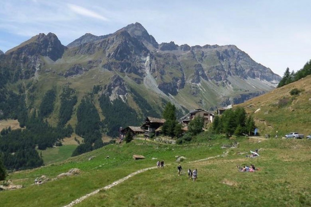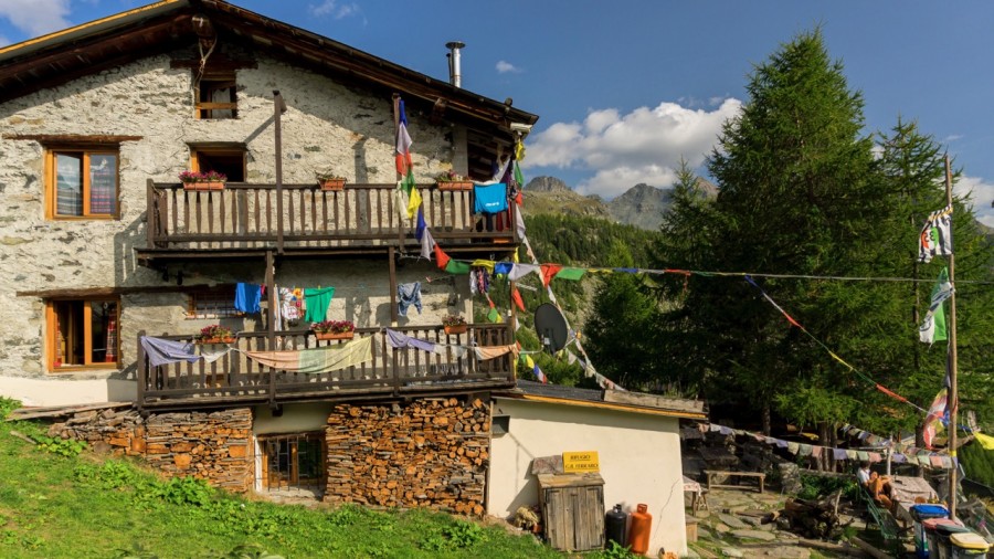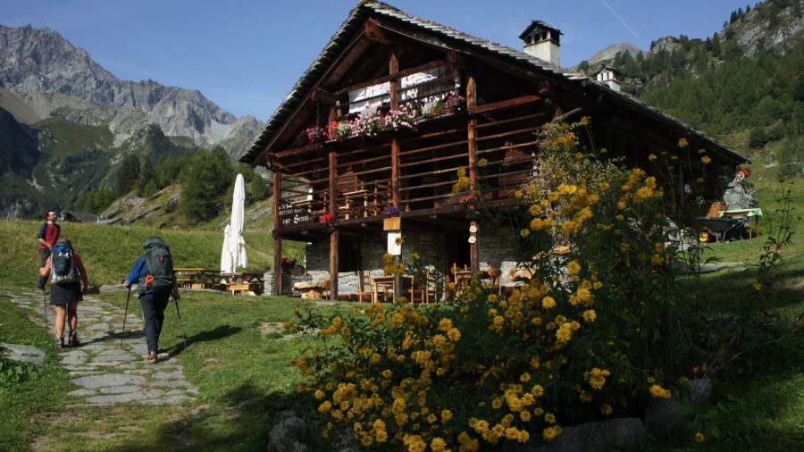 There is a gorgeous downhill trail through the larch woods to start our day, and then the chance for Italian coffee at we pass through the village of Gressoney. After a break we begin the day's climb to the beautiful and wild Saleroforko pass at 2689m (8819ft). A very efficient zig zag trail climbs the mountain, and before too long we win the col and views to the Val d'Ayas and the towering cliffs on the skyline. The descent from the Saleroforko is through a boulder field, but the trail is well-marked, and then we are on easy ground as we cross the alpine meadows. There is a sting in the tail as we have another short uphill over a broad pass, and then its an easy down through the woods and meadows to the tiny hamlet at Resy. There are some really lovely old stone and wood built traditional buildings here and it does feel like we are perched on the mountainside for the night. We love being here as our rifugio is in a stunning location and an evening drink on the terrace is something to be savoured.