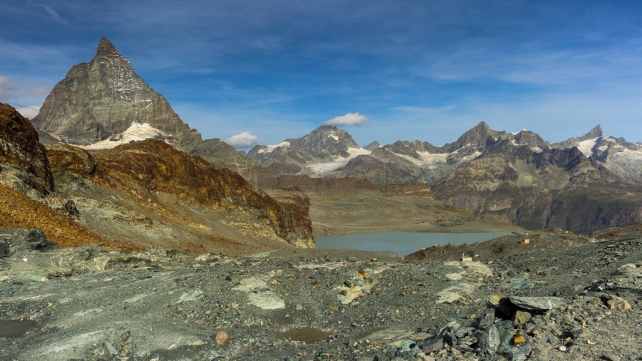 At the hut at Gandegg we leave the ice, say goodbye to our high mountain guide, and traverse glacial moraine as we head down towards the famous alpine town of Zermatt. There is the possibility that you may be able to take a cable car down to gain more time in Zermatt and to save your knees. Please note that the cost of the cable car is not included in your trip fee. After having an opportunity to explore the town we make use of the We begin with a ride on the Sunnegga funicular train folowed by the then a gondola up to Blauherd. From the lift it is a 15 minute walk up past the Stellisee lake which provides great views back over towards the Matterhorn. It is then a final 20 minute walk to your overnight accommodation at the Fluhalp Hut.