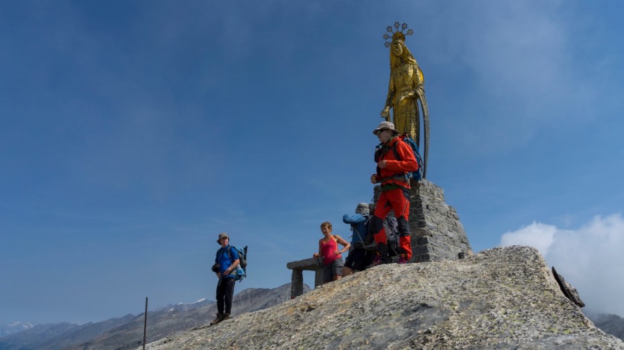 We begin our epic alpine journey the easy way! We jump on the Swiss post bus for a short ride up the valley to our departure point at Mattmark lake. The scenery is breath-taking with glaciers towering above us as we stroll along the lake side. After this easy warm up, we start the climb to our first major col of the trip, the Monte Moro pass which sits at 2853m (9357ft). Historically the Monte Moro is an important border crossing between the valleys of Saas in Switzerland, and Macugnaga in Italy. There is a golden Madonna statue to welcome us at the frontier, and the chance for our first Italian coffee at the Rifugio Oberto Maroli just below. The pass offers our first spectacular views of the Monte Rosa massif, including the two 4000ers the Weissmies at 4023m (13,195ft) and the Rimpfischhorn which reaches 4198m (13,769ft) a just reward for the effort and a perfect photo opportunity. We then have a steep descent to the lovely Walser village of Macugnaga. This remote valley is an experience in itself, with traditional Walser houses and flower strewn balconies.