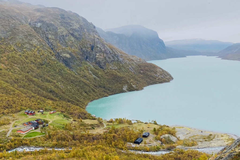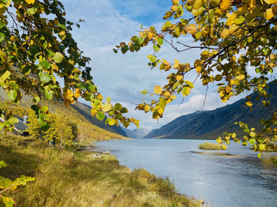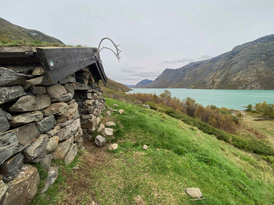 We begin with a short steady climb to our first pass of the day where we can see our route laid out ahead. Today is a day of sparkling water, and a few river crossings, as we follow a string of lakes almost all the way to our overnight stop. The largest of these is Langvatnet and we follow the shoreline all the way to the waterfall at the end. Many Norwegians travel to the Jotunheim to spend the day fishing in the lakes, where they can catch trout. Historically, fishing these lakes was an activity which provided an important part of the diet for those living in the mountains. The lakes are surrounded by steep sided mountains which still retain small glaciers creating waterfalls that rush to the lake. Today we have a few rivers to cross where our rock-hopping skills will be put into action. When we reach the end of Langvatnet we drop down beside the roaring waterfall to a lower valley which leads to Gjendebu hut and our next overnight. Gjendebu sits at the head of the huge Lake Gjende and is an idyllic spot among the birch trees.