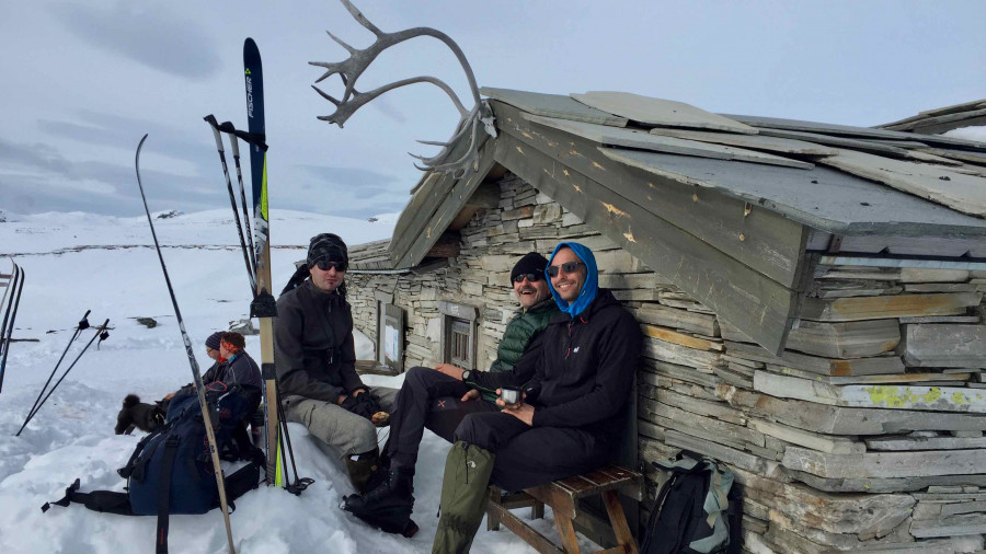 • A great trip through the open birch forest on partly prepared trails bringing us to the cosy little DNT hut at Vetåbua. The DNT huts are brilliant, stocked with food, and logs for the fire, and it's a great experience to spend a night in a remote location like this. This hut is not staffed so you can expect to do some of the chores, such as collecting water, and lighting the fire, and preparing dinner, all good fun and part of the mountain experience. We have no luggage tonight, and we will ask you to share in carrying some food for your meals, along with a few extra items for your overnight.