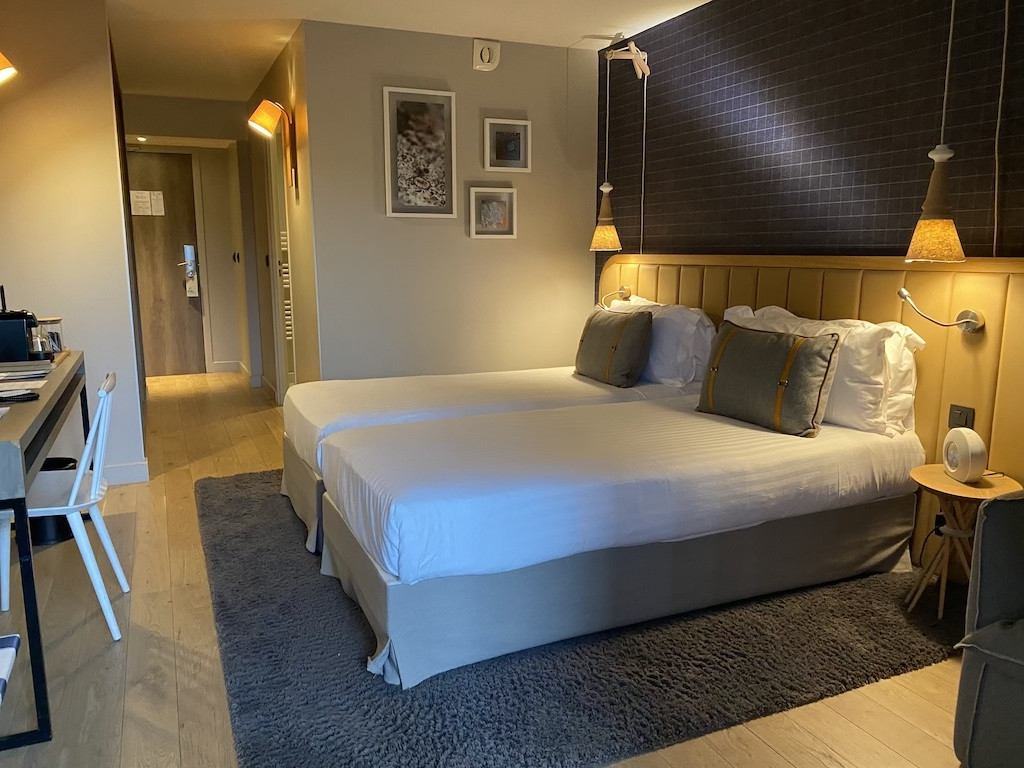 For most trips we book the bright and comfortable 'Standard' rooms. These accommodate up to two people in either a twin or double bed. Each room has a cosy feel with wood panelling and a balcony, storage space as well as cosy bedding with soft pillows and duvets. The facilities include: a bath, hair dryer, Nespresso coffee maker, kettle and teas, high speed wifi and bathrobe and slippers for the spa. Single rooms are available.